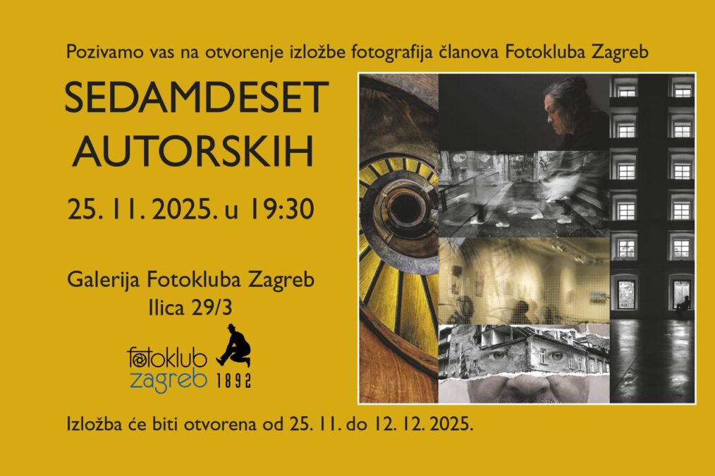 Pozivamo Vas na otvorenje izložbe fotografija „70 autorskih”, članova Fotokluba Zagreb“, koja će se održati u utorak, 25. studenoga 2025. u 19:30 sati, u prostorijama Fotokluba Zagreb, Ilica 29, 3. kat.